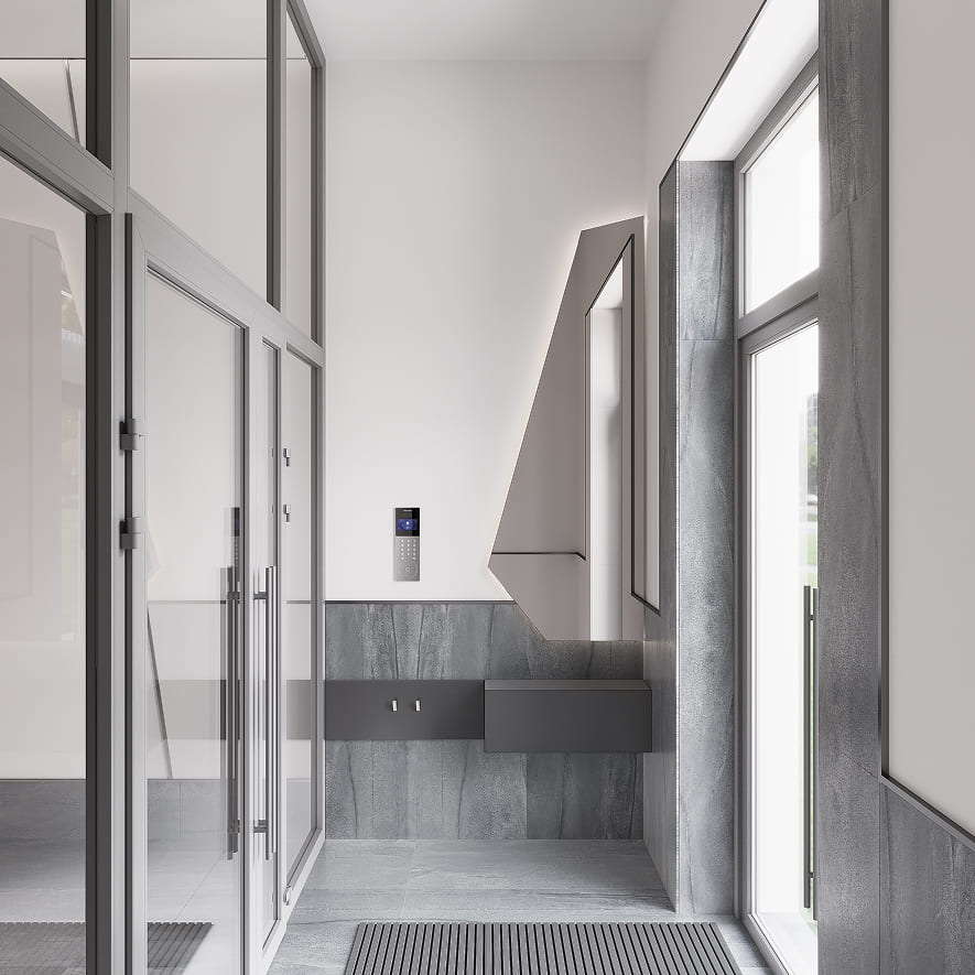 Пол – керамический кафель с чистовой отделкой согласно дизайн-эскизам. Стены и элементы интерьера оформлены в едином современном стиле, создающем уютную и представительную атмосферу при входе в дом.