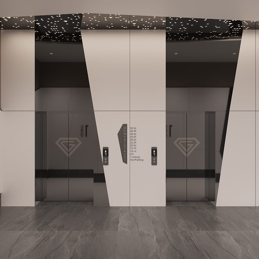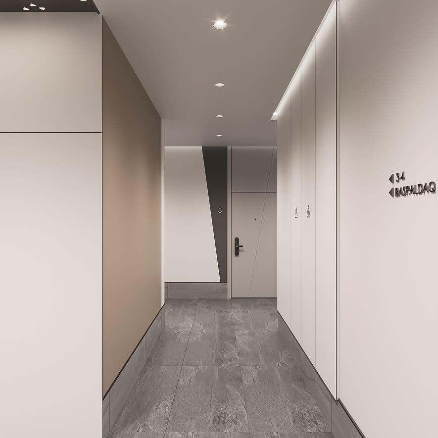 Холл жилого комплекса Gauhartas сочетает комфорт, безопасность и эстетику, создавая современную и технологичную среду.
