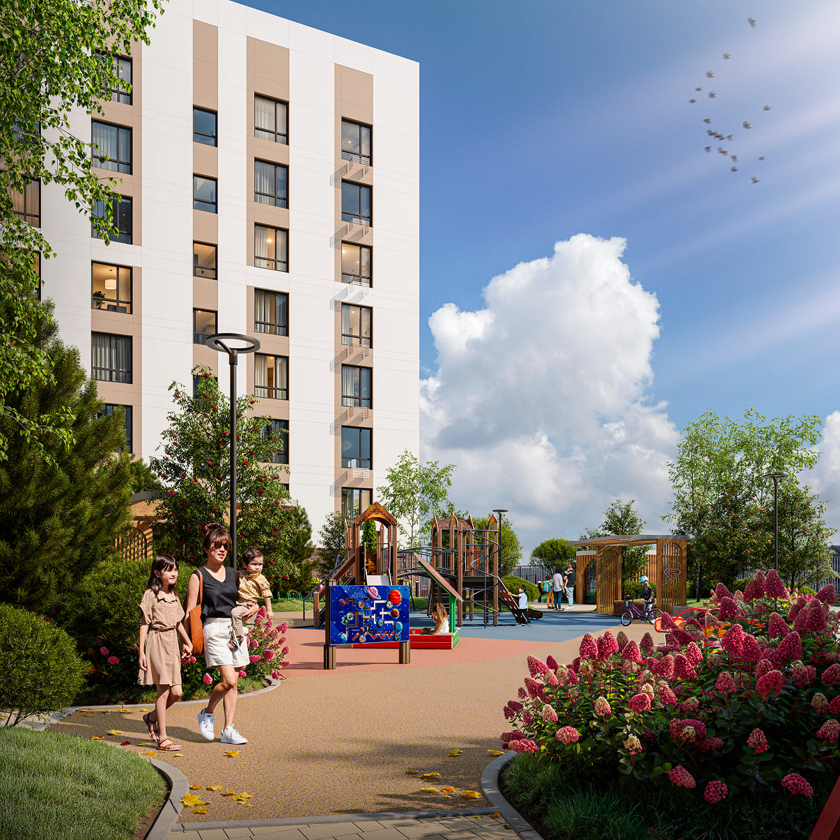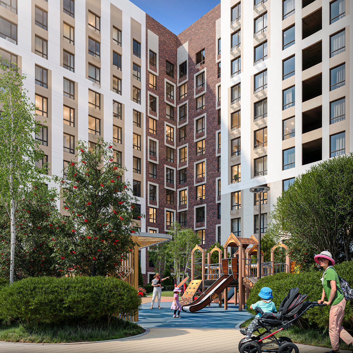 Здесь расположены зоны отдыха для взрослых, современная детская площадка и спортивная зона - всё, чтобы каждый житель чувствовал комфорт и гармонию. Территория двора закрыта и надежно защищена.