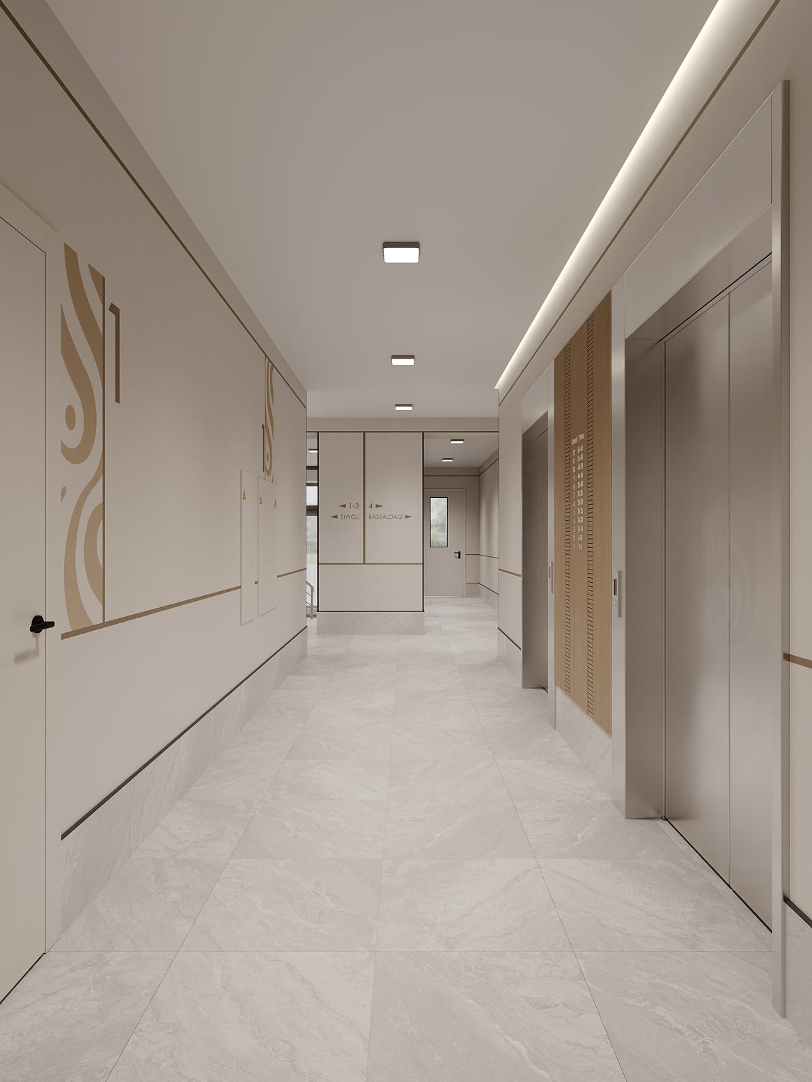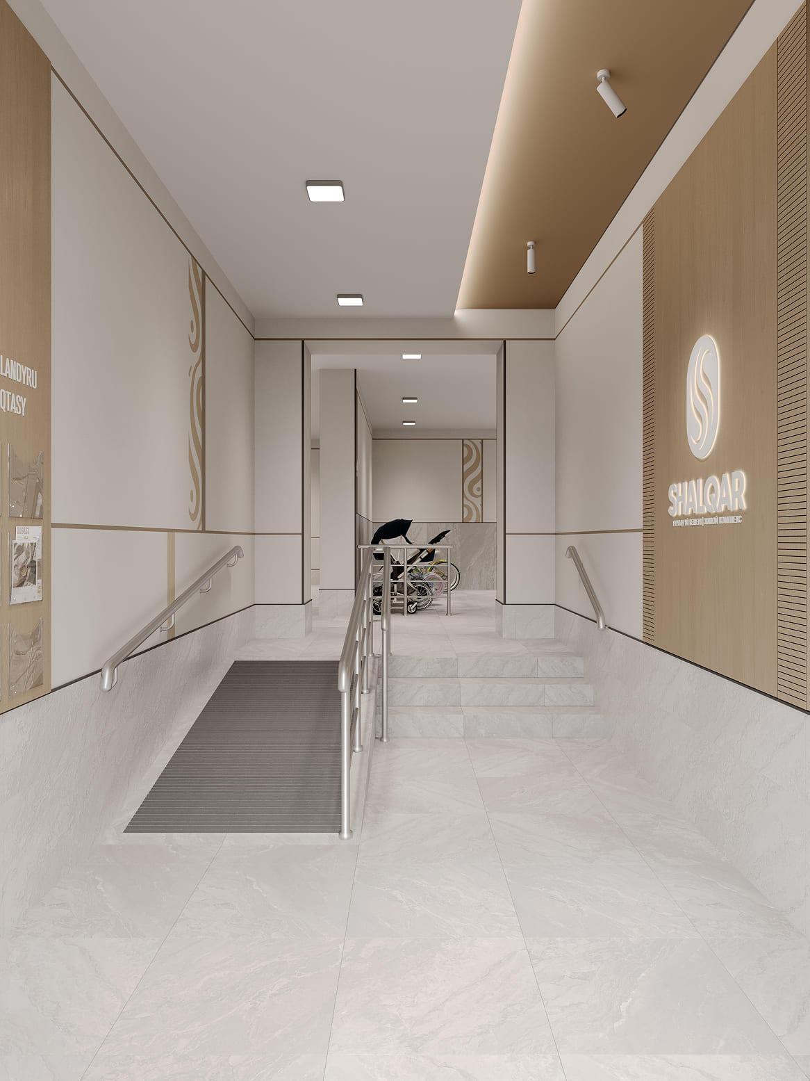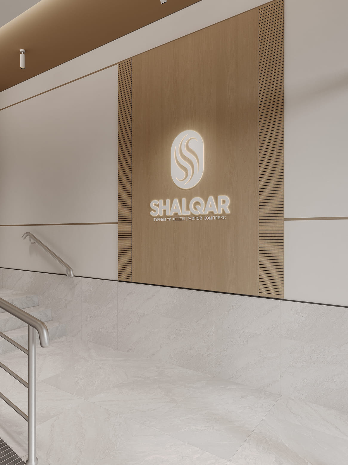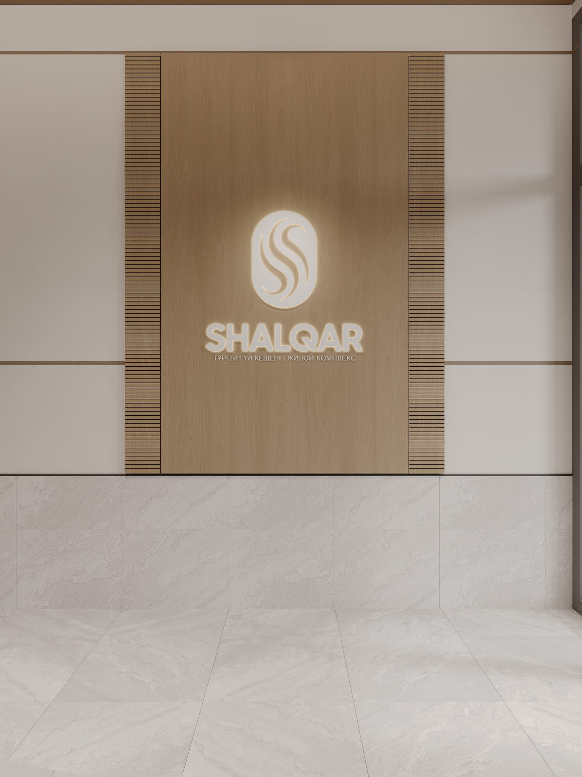 Дизайнерские холлы ЖК SHALQAR встречают жителей атмосферой спокойствия и благородного минимализма. Интерьер выполнен в теплой природной гамме: мягкие песочные и бежевые оттенки стен визуально расширяют пространство, наполняя его воздухом и светом.