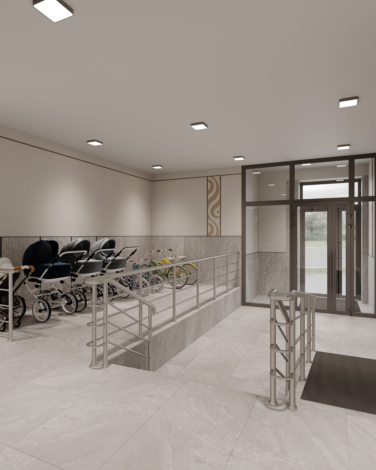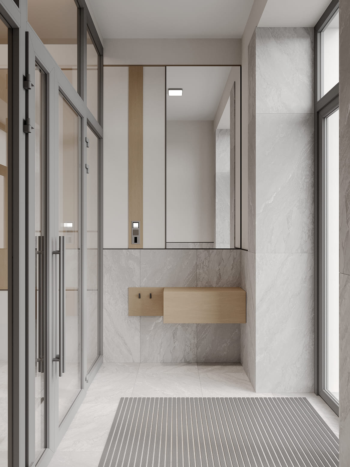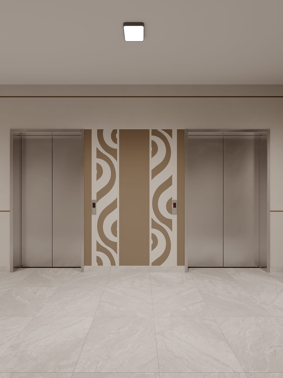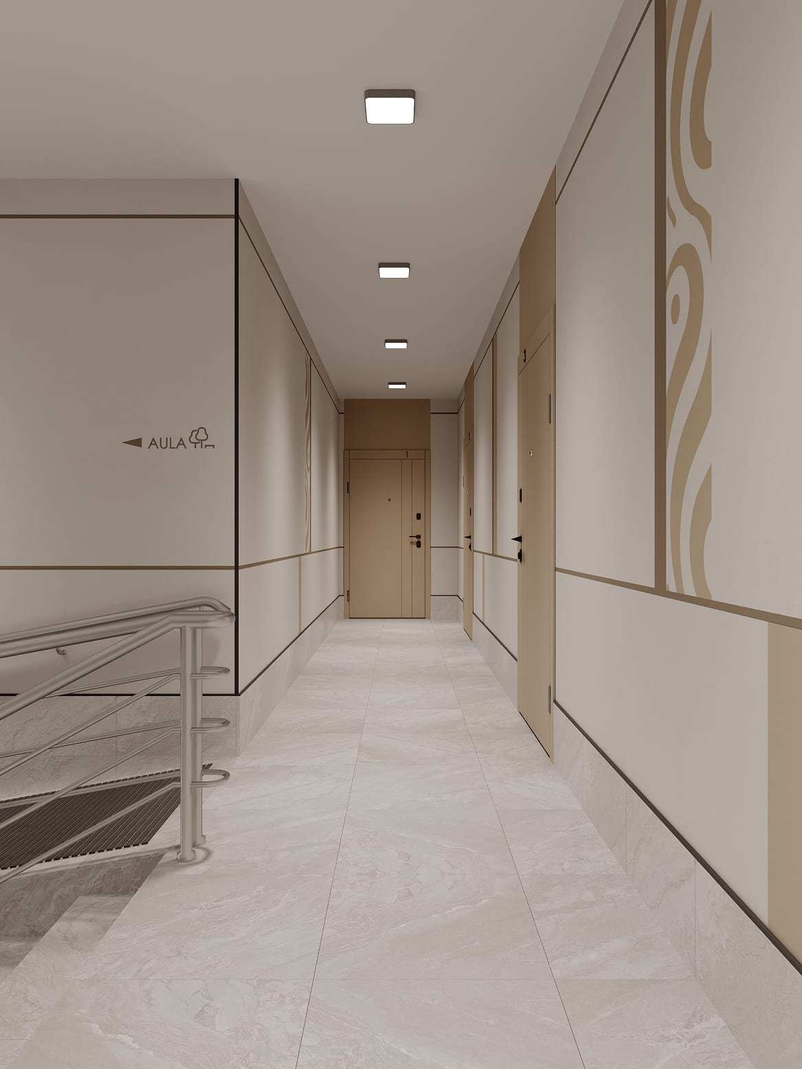 Дизайнерские холлы ЖК SHALQAR встречают жителей атмосферой спокойствия и благородного минимализма. Интерьер выполнен в теплой природной гамме: мягкие песочные и бежевые оттенки стен визуально расширяют пространство, наполняя его воздухом и светом.