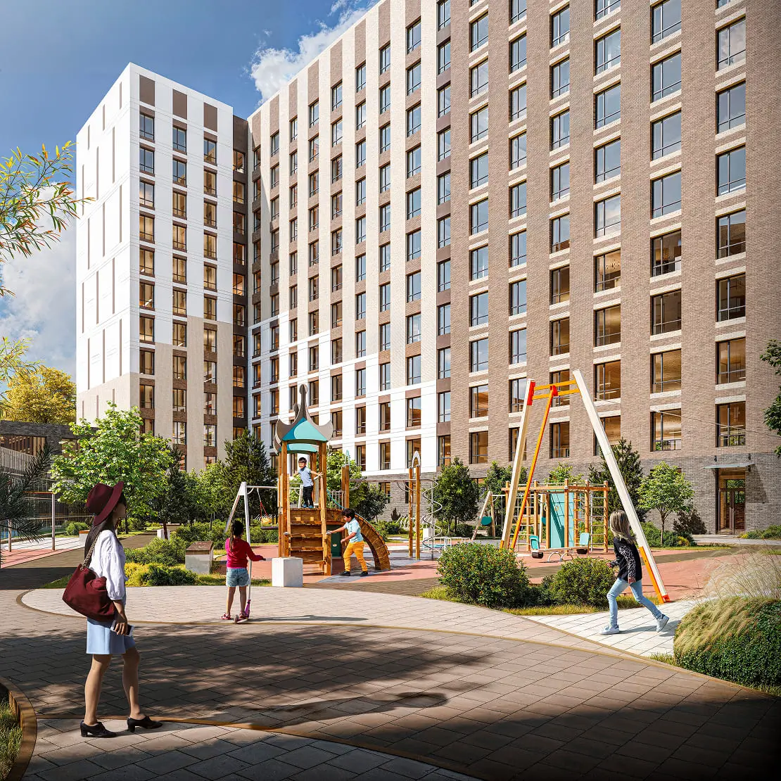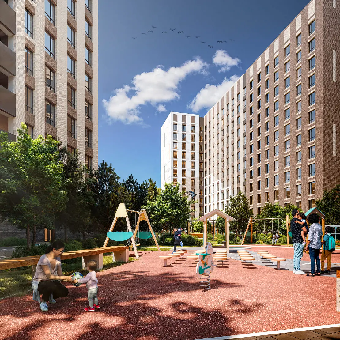Двор на уровне первого этажа спроектирован как уютное и безопасное пространство для жизни. Здесь расположены зоны отдыха для взрослых, современная детская площадка и спортивная зона - всё, чтобы каждый житель чувствовал комфорт и гармонию. Территория двора закрыта и надежно защищена.
